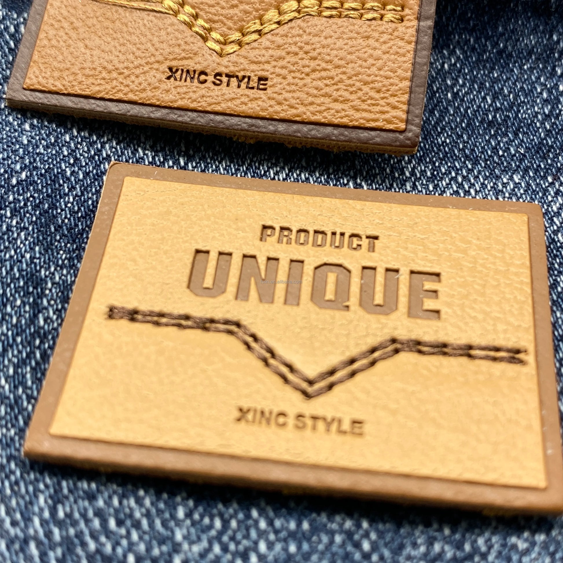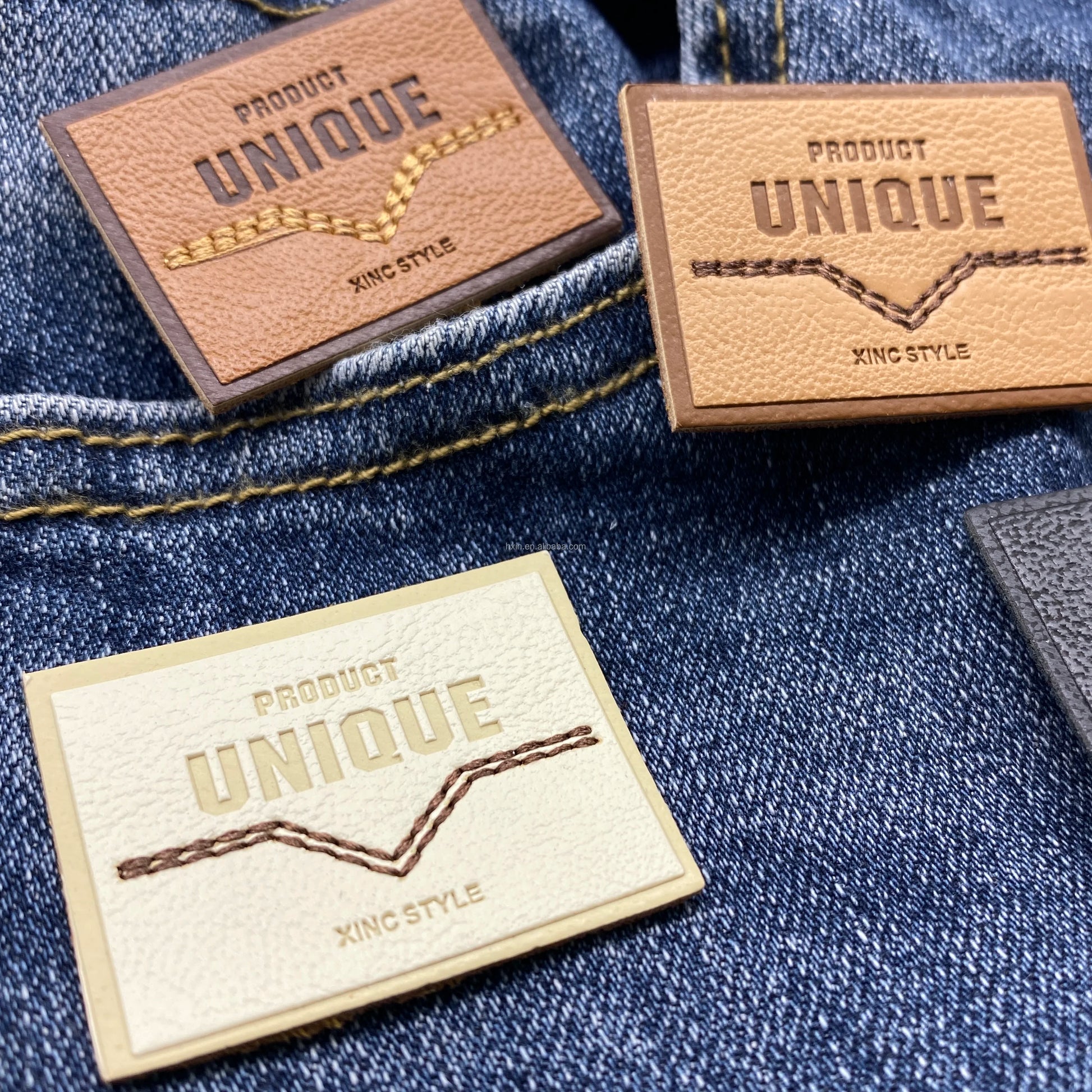 Юқори сифатли махсус ювилиши мумкин бўлган нақшинкор логотип жинси кўйлаги учун ПУ тери ёрлиғи ёрлиғига тикилган