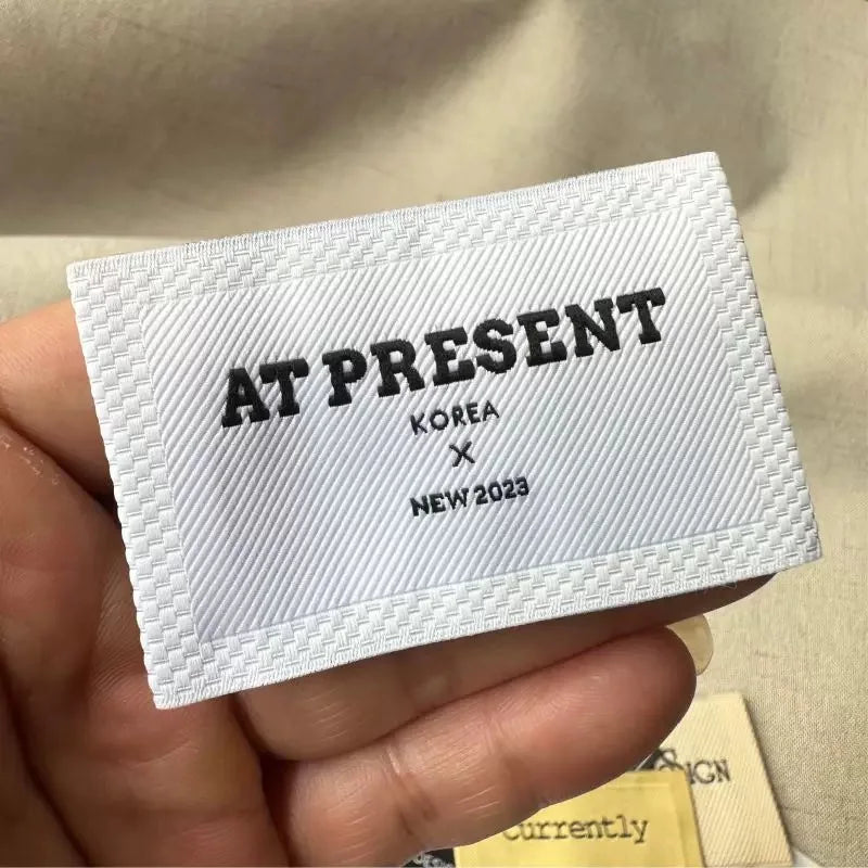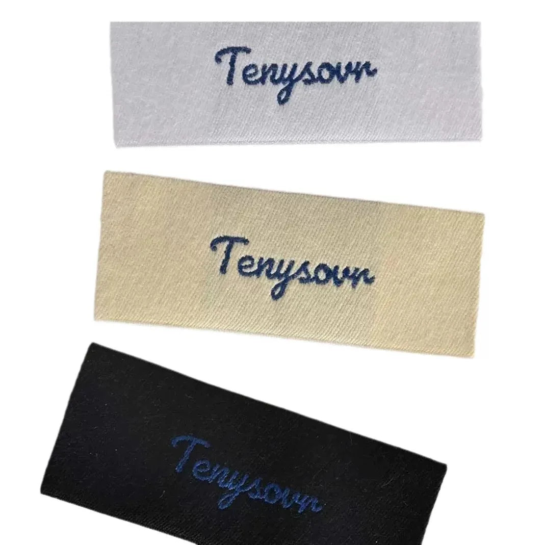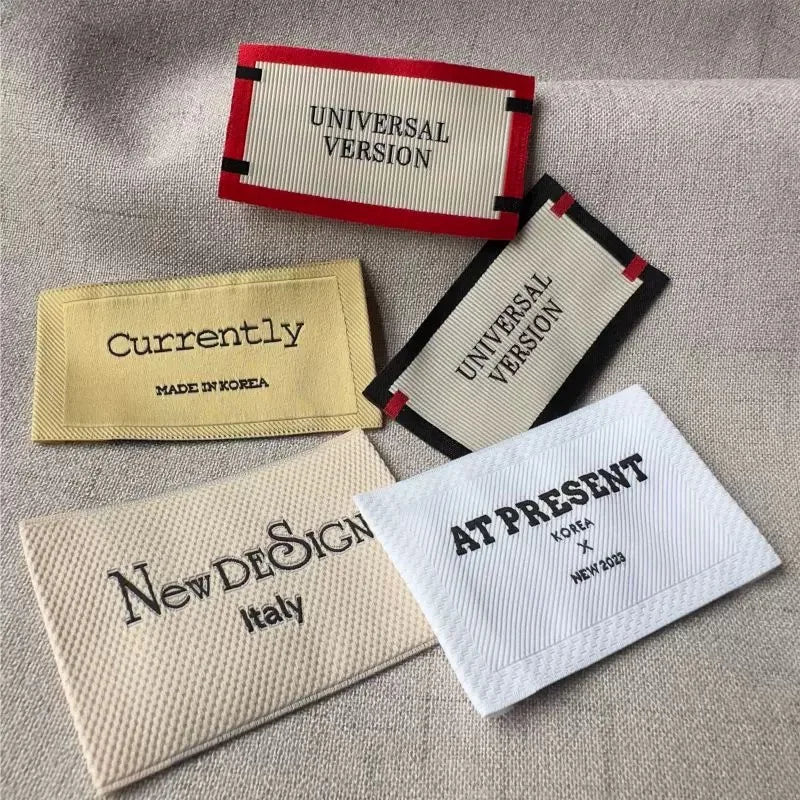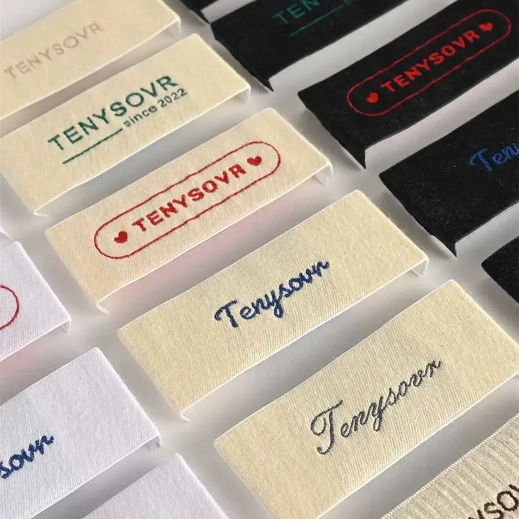 Кийимлар учун махсус шахсий ном логотипи охирида полестер кийим тўқув бўйин ёрлиғи